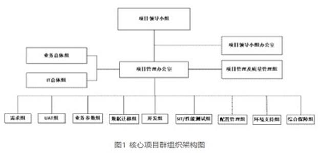 对核心建设项目的组织架构进行创新,形成以项目型为导向的组织架构,使项目组本身有足够的职权,摒弃职能化组织架构组织横向之间联系薄弱、部门间协调难度大的缺点,缩短沟通、协调和决策的时间。项目领导小组是核心项目群建设的最高管理机构,主要负责制定工作目标和方针,对重大事项作出决策,下设项目管理办公室作为具体执行机构。项目管理办公室主要负责全面管理项目、定义项目范围、审批项目计划、监控项目进展等,及时决策项目发生的重要事项和处理重要突发事件,确定隶属各小组的工作职责并对其工作进行监督和指导。项目管理办公室下可设业务总体组、IT总体组、项目管理及质量管理组等,组织架构如下图所示。