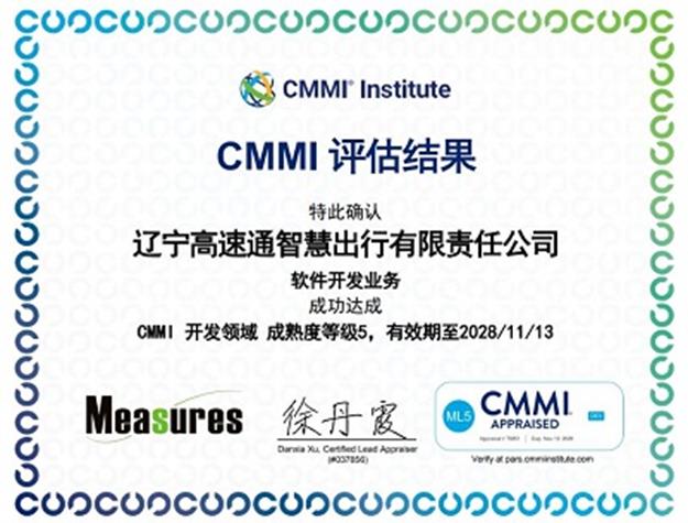 辽宁高速通智慧出行有限责任公司成功通过CMMI开发领域成熟度等级5级认证