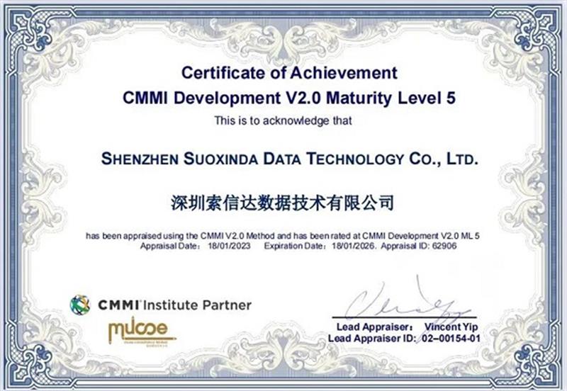 近日,深圳索信达数据技术有限公司(简称“索信达”)顺利通过CMMI 5级认证,并获颁评估证书,标志着索信达的软件研发能力、项目交付能力、组织过程能力、质量管理水平等在标准化、规范化、成熟度方面达到了国际最高标准。