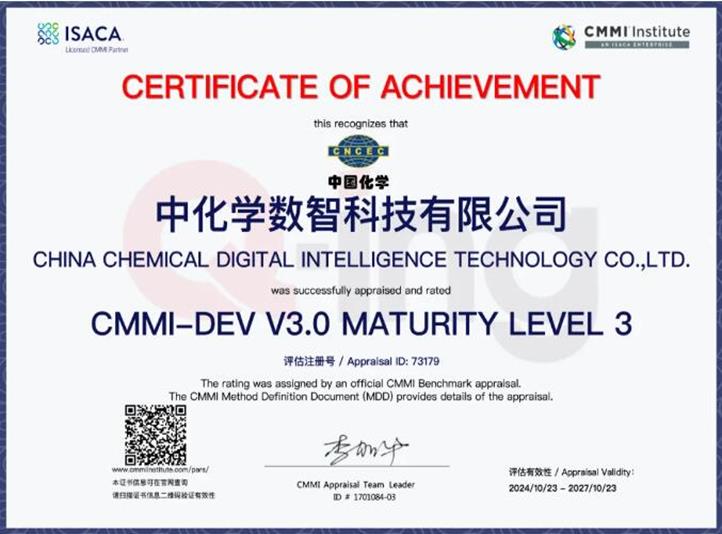 近日,中国化学数科公司成功通过了CMMI(Capability Maturity Model Integration)三级成熟度认证,这是国际软件工程和研发管理领域的权威认证之一,标志着公司在产品研发及项目管理方面达到了新的高度。