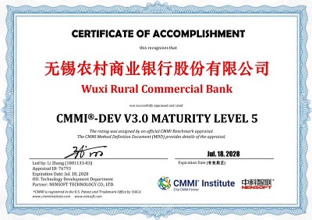 五年磨一剑!无锡农村商业银行获得CMMI5认证