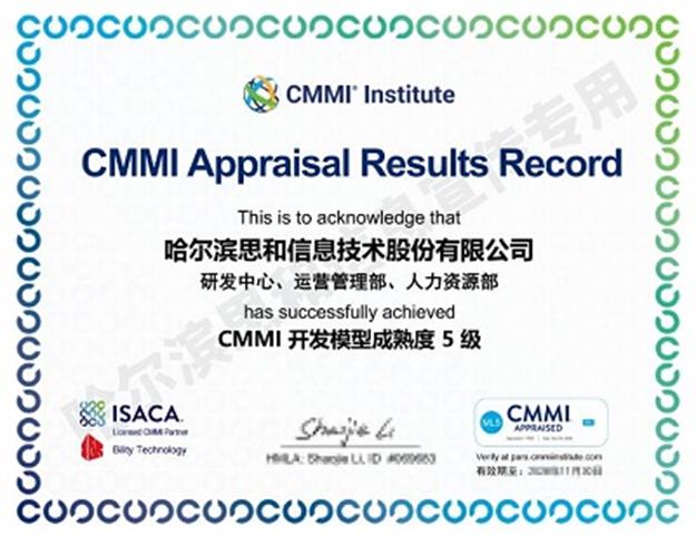 喜报!哈尔滨思和信息技术股份有限公司(以下简称 “思和信息”)顺利通过国际权威机构评估,正式通过 CMMI V3.0 开发模型成熟度5 级认证。