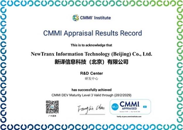 新译科技正式通过CMMI3级(能力成熟度模型集成三级)国际认证,并获颁正式证书。标志着公司在软件研发、项目管理、质量保障及过程改进等方面已达到国际先进水平,是公司发展历程中的又一重要里程碑。