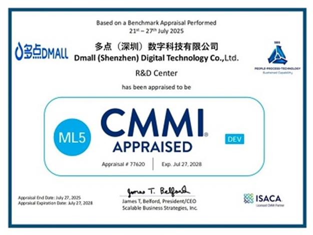 近日,经ISACA CMMI研究院权威评审,多点(深圳)数字科技有限公司正式通过 CMMI 能力成熟度集成模型 5 级认证!