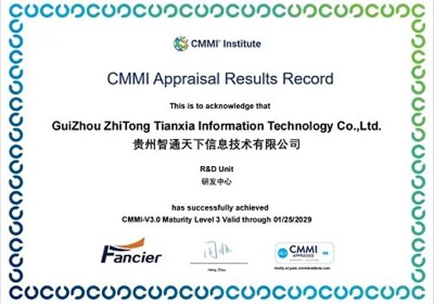 CMMI(Capability Maturity Model Integration,即能力成熟度模型集成)是目前世界公认的专门针对软件产品的质量管理和质量保证标准,它不仅仅是对产品质量的认证,更是一种软件过程改善的途径,是推动软件企业在产品的研发、生产、服务和管理上不断成熟和进步的手段,是一种持续提升和完善企业自身能力的过程。截至目前,智通天下公司已获得“高新技术企业”“贵州省科技型中小企业”“贵州省创新型中小企业”“贵州省专精特新中小企业”、ITSS 三级认证、CS二级认证、 DSMM二级、ISO系列等多项资质。