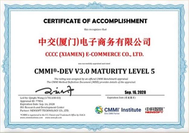 近日,中交(厦门)电子商务有限公司(以下简称“电商公司”)顺利通过国际软件能力成熟度模型集成(CMMI)五级认证,并正式取得认证证书。这一重要成果标志着电商公司在软件研发能力、项目交付质量及持续创新能力等方面均已达到国际领先水平,为央企数字化转型和市场化改革树立了行业标杆。