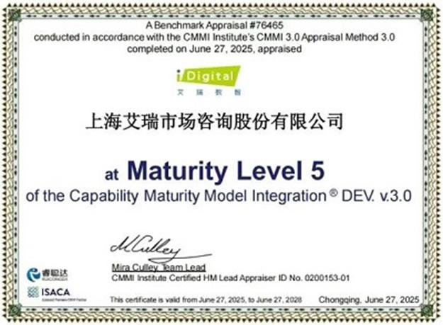 此次认证历经严格的评估流程,国际评估团队对艾瑞数智的流程执行情况、文档资料、实际操作等进行了全面审查,最终认定符合CMMI5级标准。