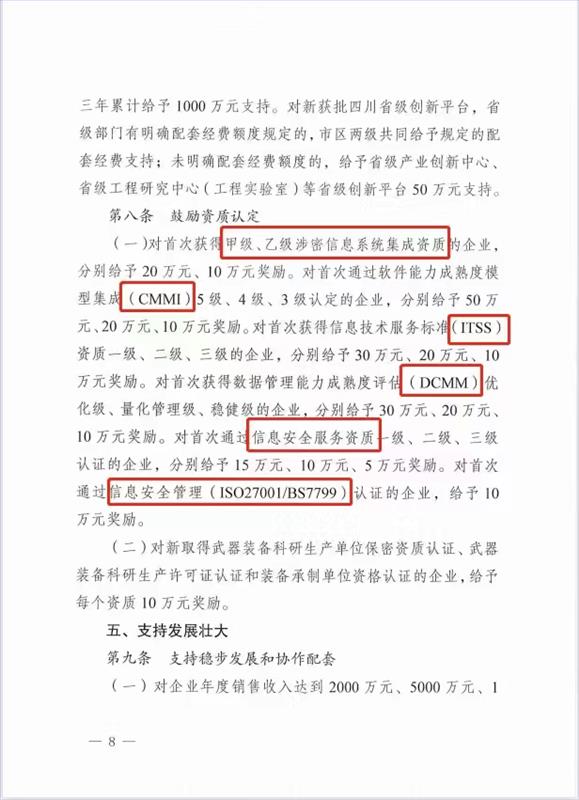 四川天府新区对通过CMMI认证5级、4级、3级的企业,分别给予50万、20万、10万元奖励