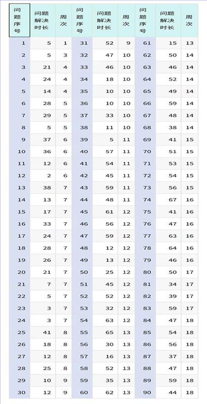 某公司搜集了18周90个问题的解决时长(小时)数据如下表,有了这些数据后,可以做哪些分析呢?