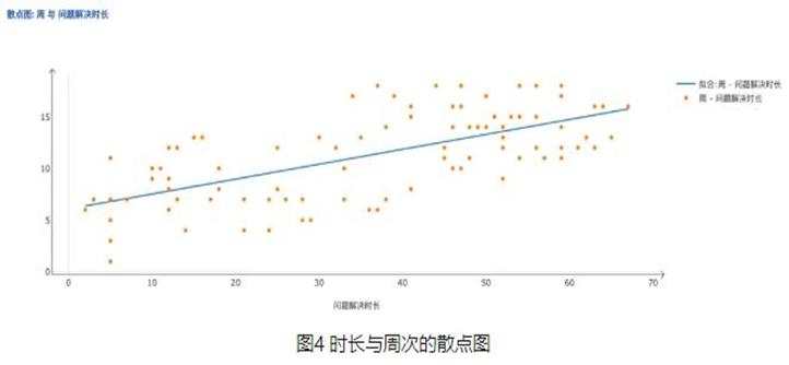 如果把90点的数据以散点图的形式展现出来,横坐标是周次,纵坐标是每个问题的解决时长,则我们能看到一个整体缓慢上升的趋势。