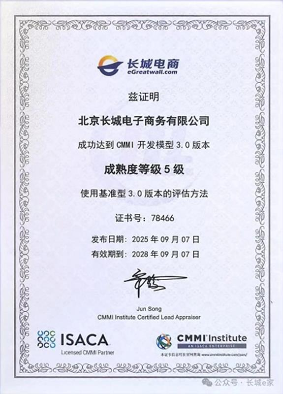 近日,长城电商软件研发及过程管理体系经过CMMI研究院评审,顺利通过CMMI-DEV V3.0成熟度五级认证,标志着公司在软件研发能力、过程管理水平和组织成熟度等方面已达到国际领先水平。