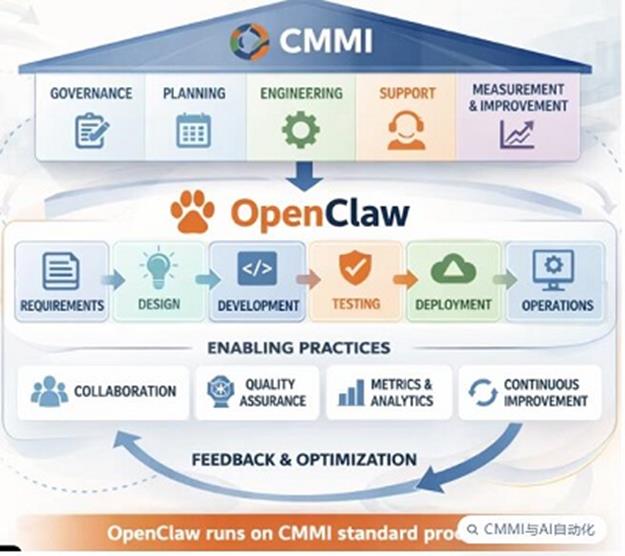 过去我们做CMMI,流程得自己定、自己执行,很多人觉得麻烦,觉得是多此一举,不如直接上手干活。于是,“少流程、少文档”就成了普遍现象。但现在有了小龙虾,情况不一样了——只要你流程够标准、质量够高、纠错能力够强,小龙虾就能帮你搞定大部分工作。那些已经实施CMMI的企业,在引入小龙虾时,往往上手更快、用得更顺,效率和业绩也提升得更明显。