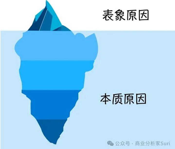 在商业世界里,我们找问题原因的时候,也可以用这个冰山模型来分一分。表象原因,就像是冰山上面的那部分,肉眼一看就能看见,但这些往往不是解决问题的关键。本质原因,就像冰山下面藏着的那些,虽然不好找,但这才是解决问题的关键。找到了本质原因,就像是找到了问题的根儿。