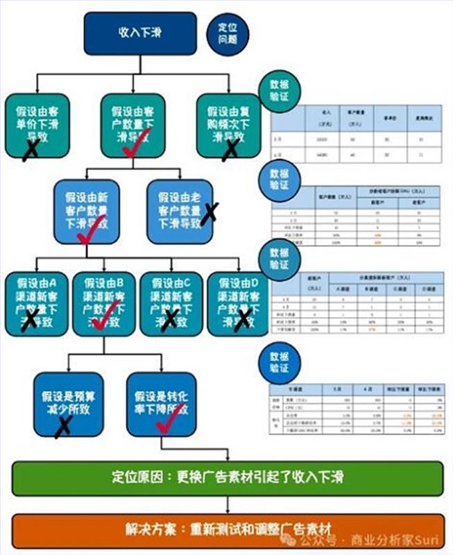 举个例子,某公司的收入出现异常下滑,如何用假设验证寻找根本原因?