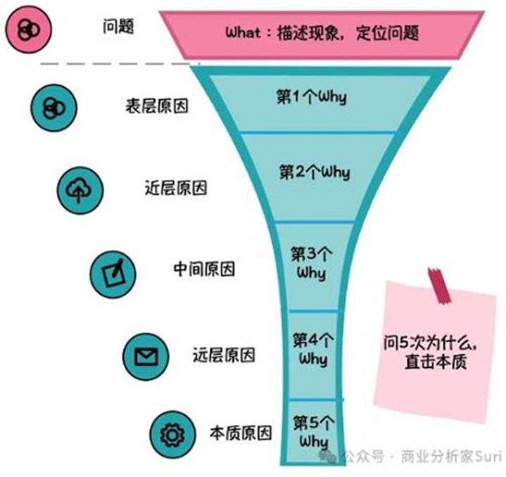5WHY分析法和麦肯锡的“WHY SO/SO WHAT”,其实都是一个道理。最早是丰田搞出来的,也有人叫它“5问法”。意思就是对着一个问题,连续问上5个“为什么”,就像跟着线索一样,一层层地往深了挖,直到挖到问题的根本原因,然后就能直接针对这个原因来解决问题了。这招的厉害之处就在于,对一个问题死磕到底,不找到最深层次的原因绝不罢休。