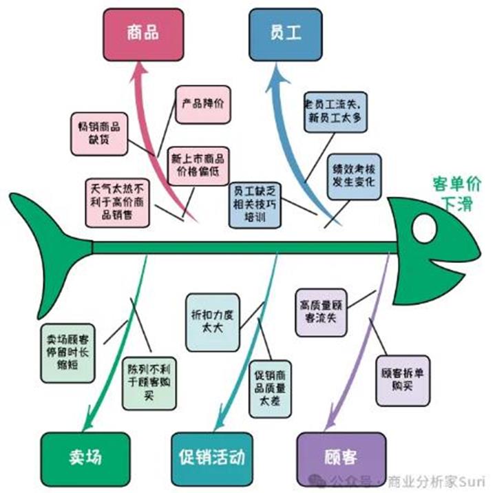 比如,客单价下滑了,用鱼骨图如何分析原因呢?